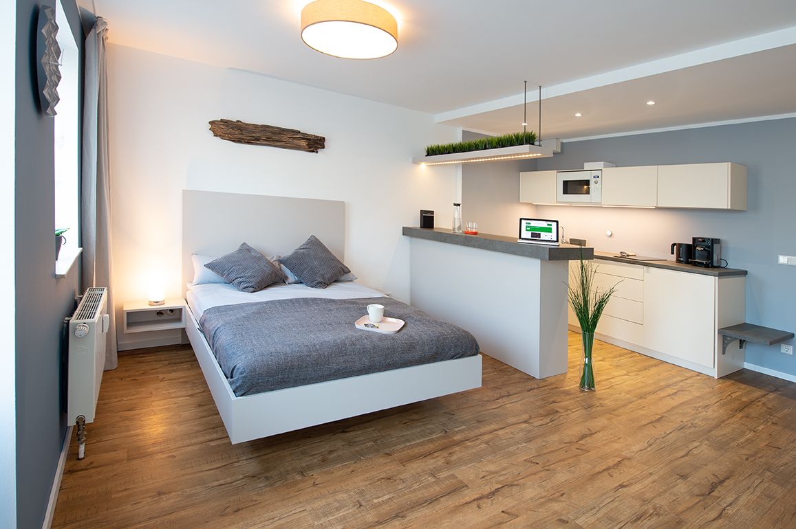 This is a compact apartment in which living and sleeping space are combined, often with an open kitchen.