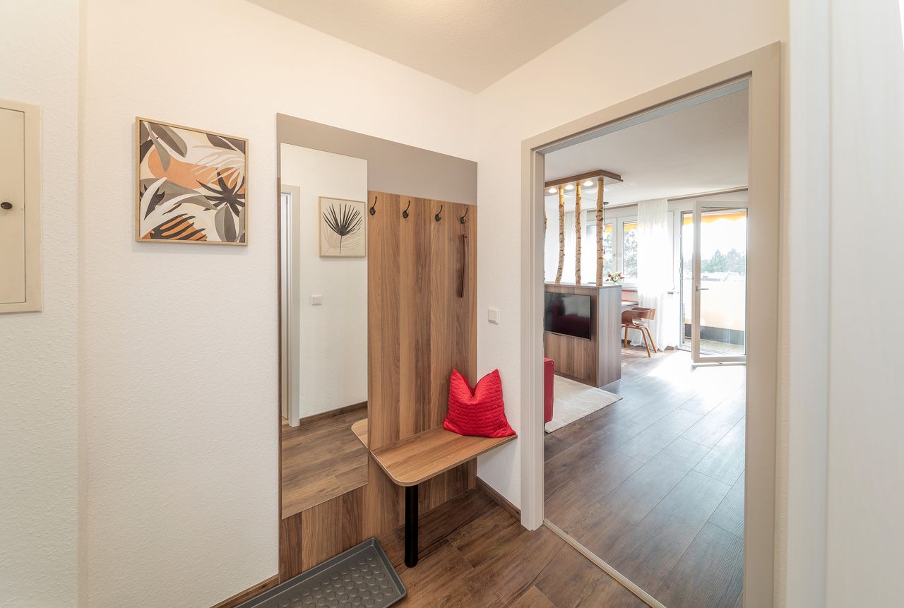 This is a compact apartment in which living and sleeping space are combined, often with an open kitchen.